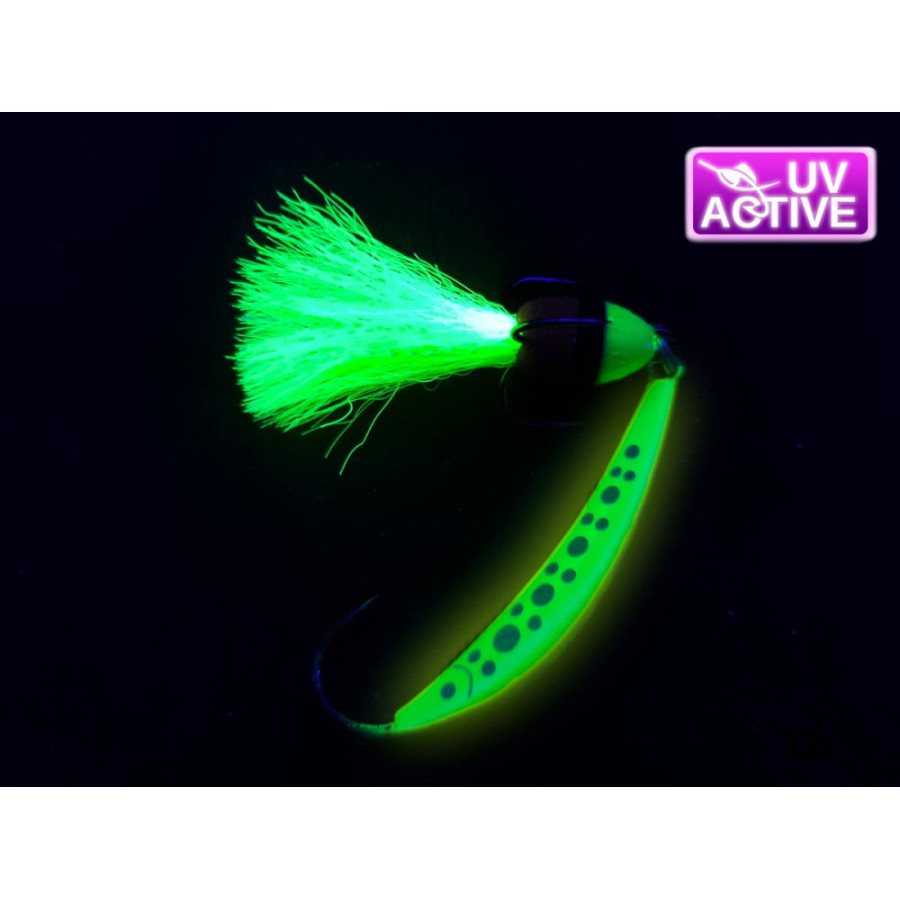 Блесна покрыта специальной краской с эффектом UV-Active, которая светится в ультрафиолете. Это делает её особенно заметной для рыбы в условиях низкой освещенности или на глубине.